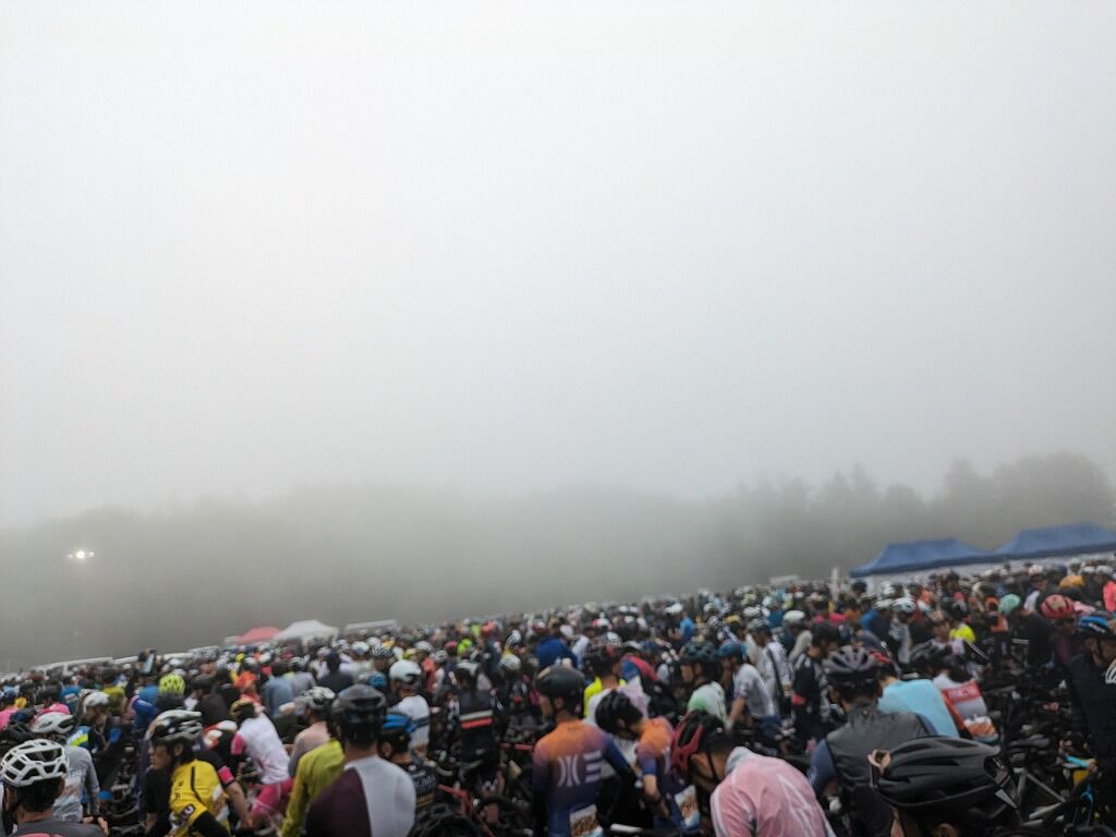 実走で体を温めてきたことと、実はかなり緊張ををしていたようで並んだときはそこまで寒さを感じていなかったのですが並び始めて数十分、出発10分ぐらい前からは、思い出したかのように体がガチガチと震え始め、スタートまでの待ち時間は極寒でした。その寒さと緊張もあり、トイレに行って並んだのにもうすでにトイレに行きたいという切ない状態でした。