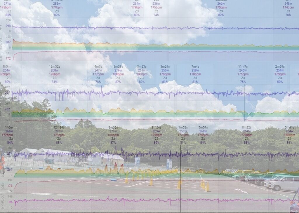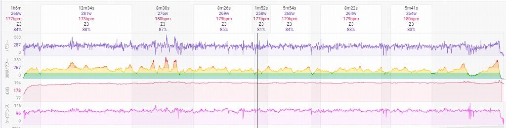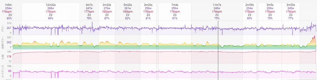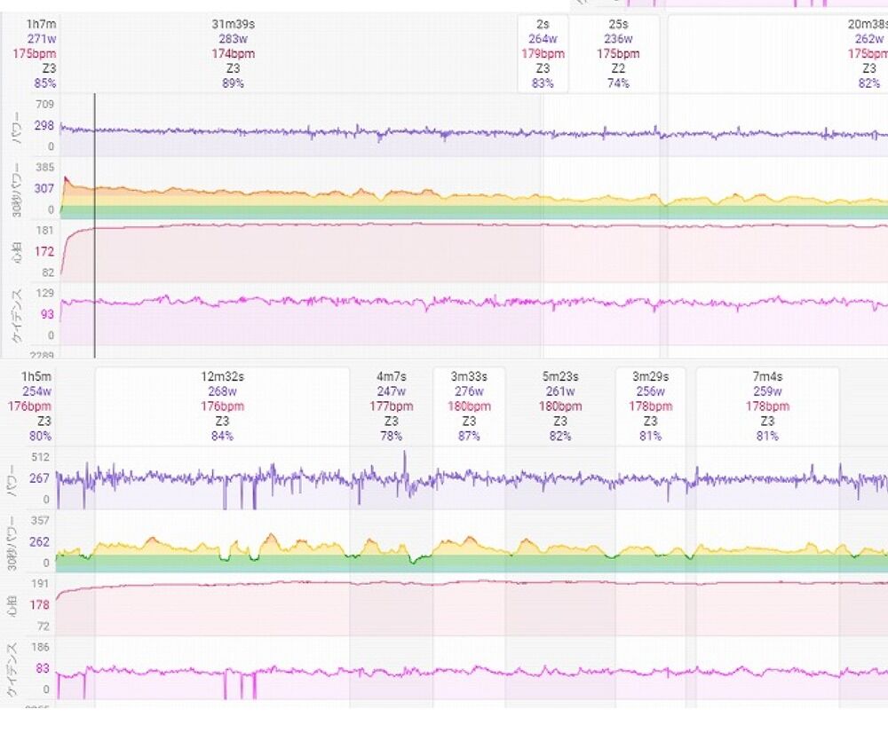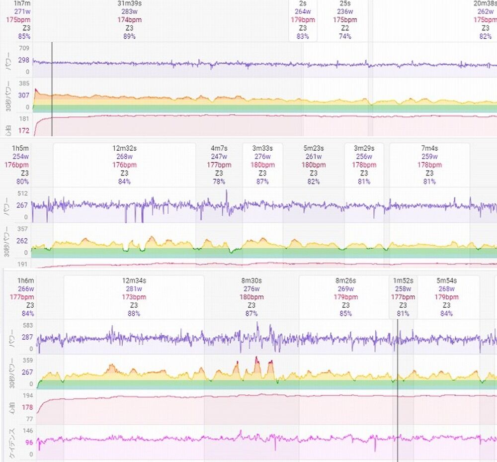 それを加味してもまず紫線のパワーの振れ幅は2023年以上に大きいです。試走のとき比べると明らかに荒ぶっている感があります(笑)