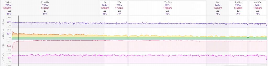 開始30分は徐々に垂れつつも平均283Wオレンジ中心の強度です。その後も順調に垂れ続け中盤は黄色中心、後半では黄色の中に緑色が見え隠れ、パワーにして250Wぐらいまで減少が見られます。