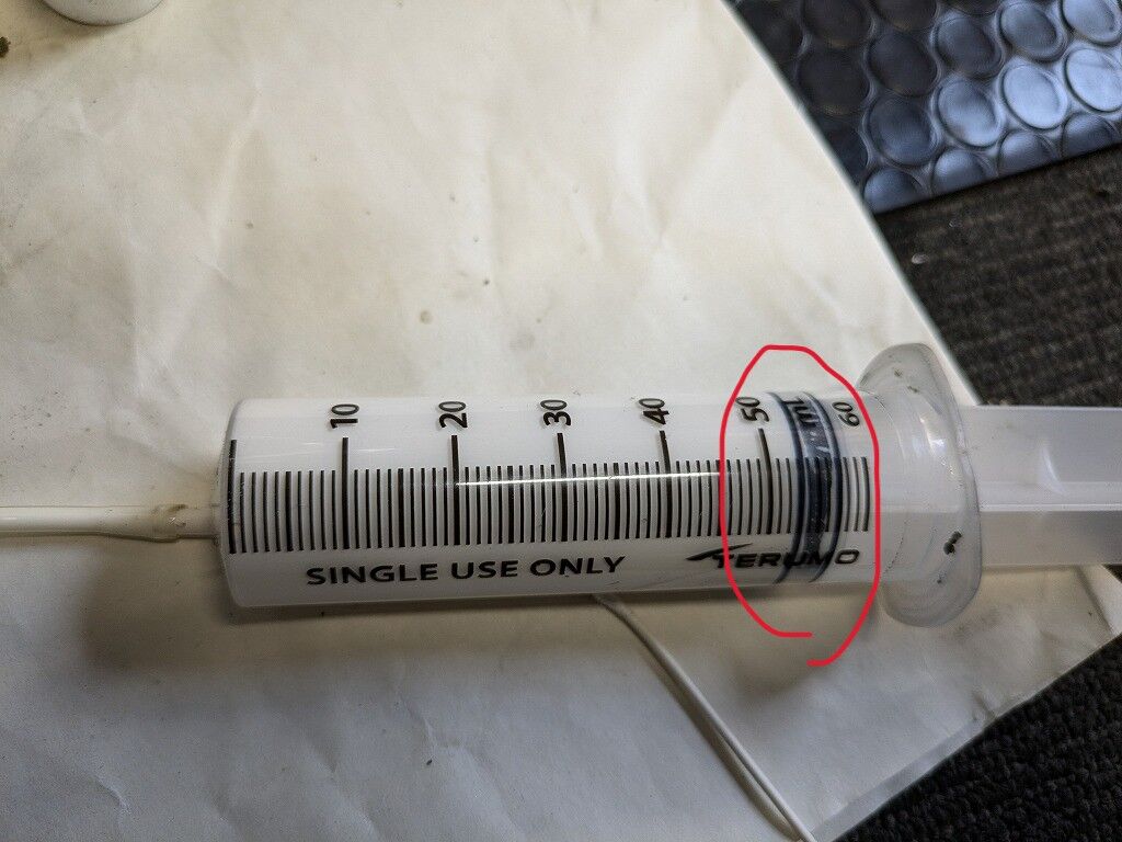 マクハルがプガスケットの再度に隙間から入り込むと、途端に動きが悪くなります。それを防止するためには60mlシリンジでは50ml以上吸わない、です。50ml以上になるとプランジャーもまっすぐ引っ張りずらくなり斜めに傾くと、隙間に入り込みやすくなるからです。