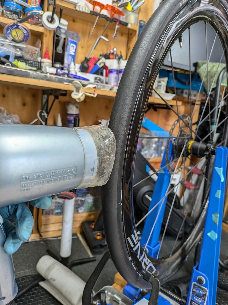 また飛び散る量はそこまで多くはありませんが、飛び散る原因はこれだけではなく、たとえは空気を抜いた際にビードが落ちて飛び散ったり(嵌合が甘い場合)、ビード部になじませている時に飛び散ったりする場合もあります。