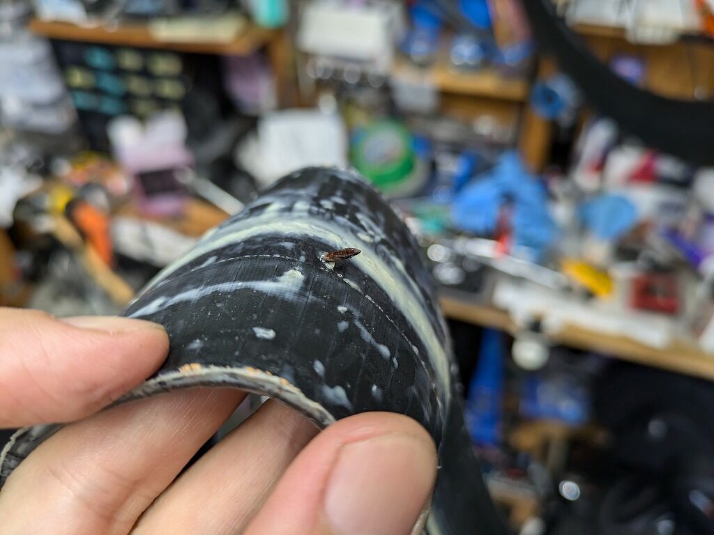 傷も大きくはなくタイヤの変形がなかったのですが、しっかりと空気の漏れが確認できました。