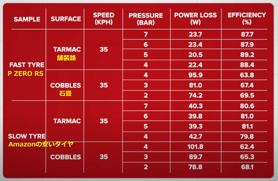 空気圧の重要性ですが、普段空気圧は大体パンクをしなければよい、というだけの設定では非常にパワーロスが多い可能性がある、ということです。