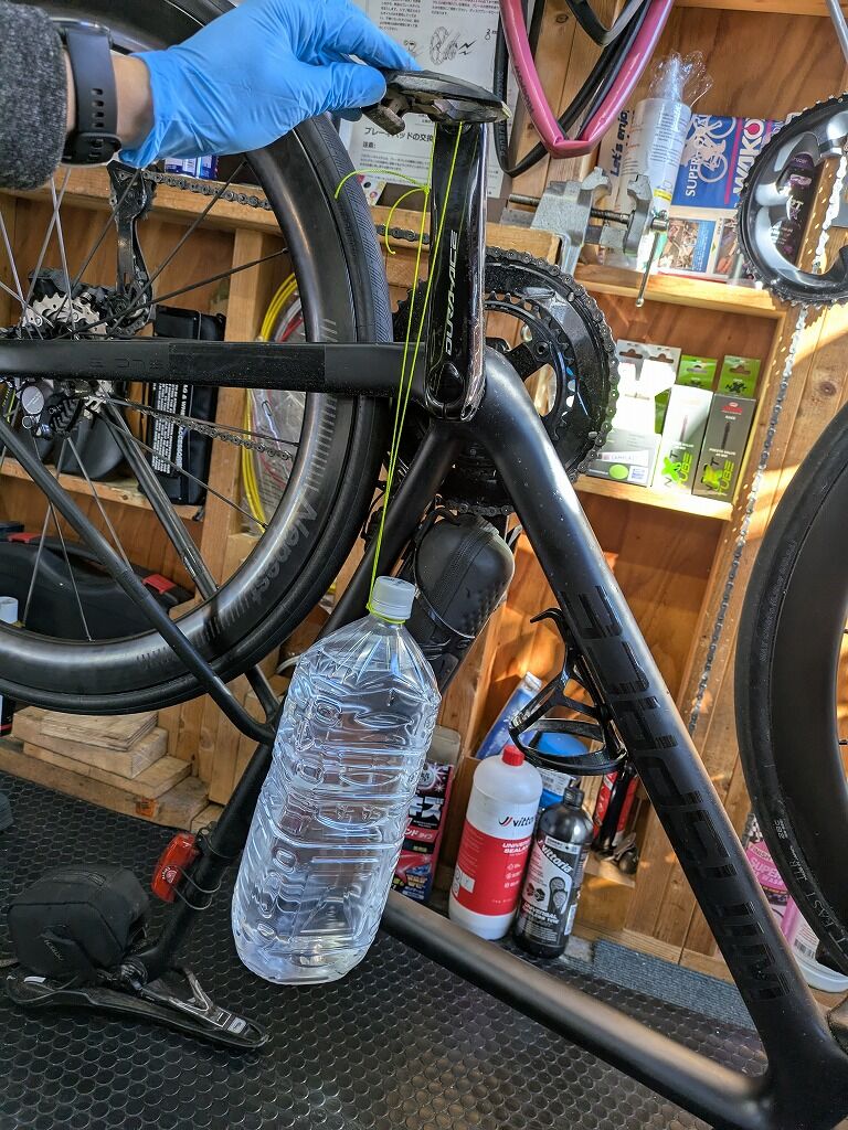 これをペダル軸に付け、0時で後輪方向にクランクが回るように手を離し、自然落下させます。ペットボトルは床にドスンと着地後、クランクの回転が止まり、リアホイールは回転を続けます。この状態からホイールが止まるまでの時間を計測いたしました。