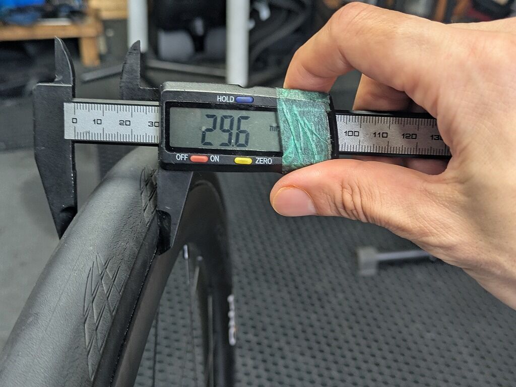 ちなみに28cのContinental GP5000のクリンチャーを4.6BARで組んだ際には、タイヤ幅が29.6mmでした。