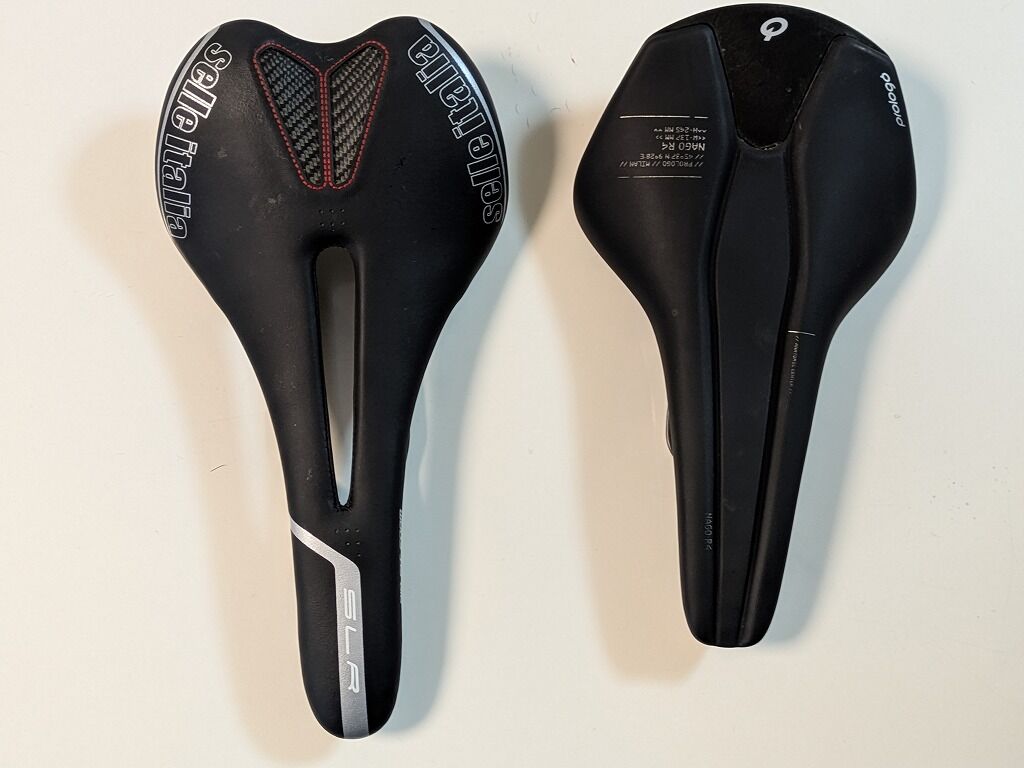 従来のノーマルサドルSLR(左)と、今風のサドルNAGO R4(右)を例に比べてみます。