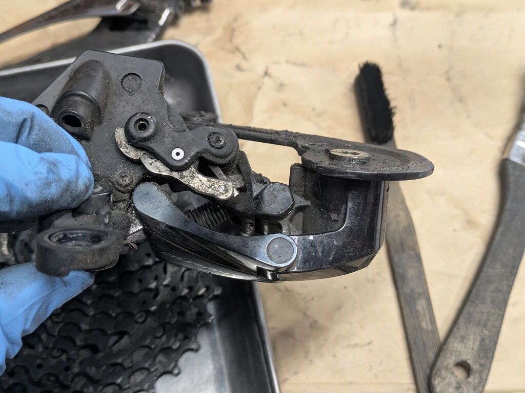 リアディレイラーも全体がくすみ、プーリー部の回転もやや重く感じました。