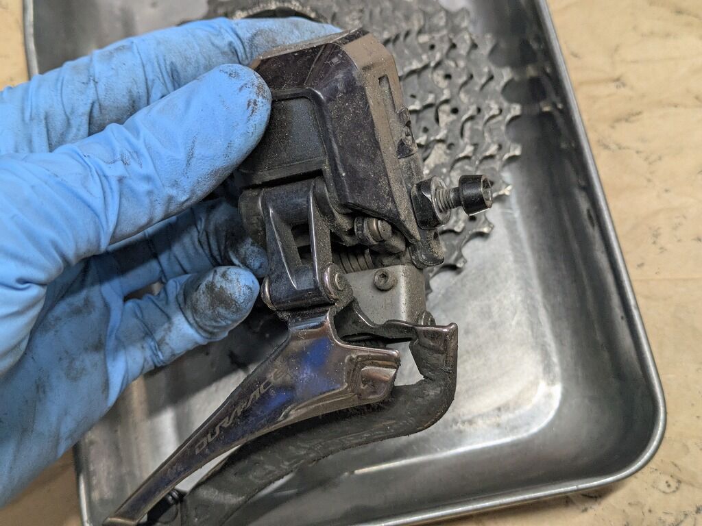 フロントディレイラーの前面には走行時の巻き上げ汚れがこびりついていました。