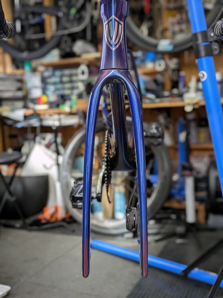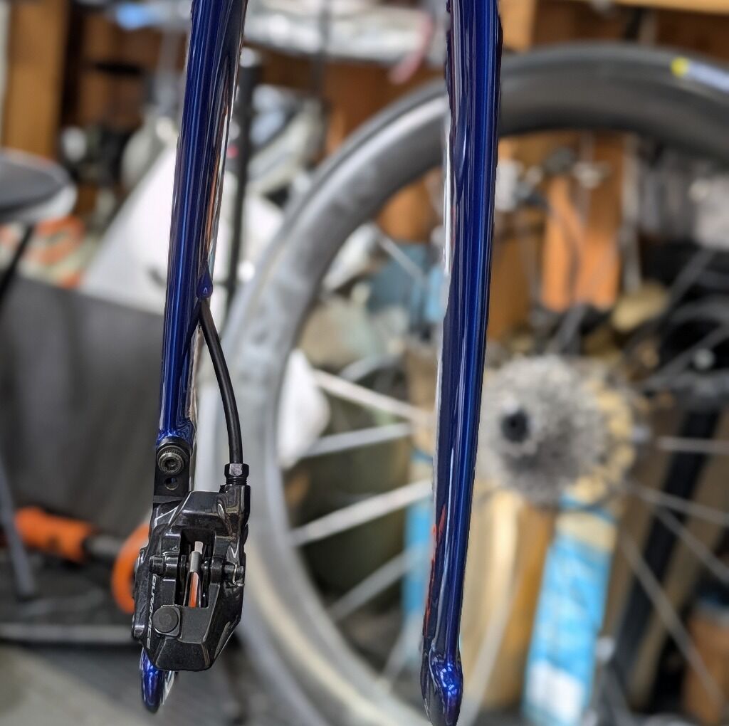 UCI規定ギリギリのワイド形状を採用したフロントフォークとのことです。