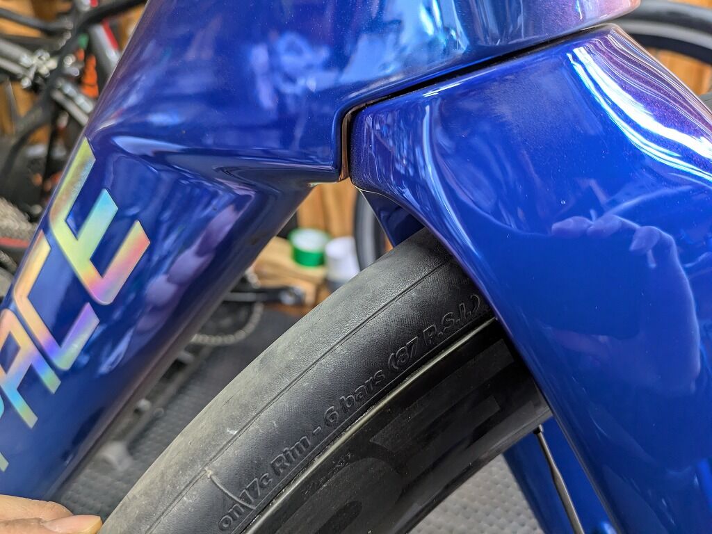 クラウン部分をタイヤと極限まで近づけているのは、フォークとフレームの境界をなくし、空気をフォーク内側へ乱雑に入り込ませないためです。入り込んだ僅かな空気も、タイトな内面をガイドとして利用し、タイヤの回転に干渉させず後方のダウンチューブへ整った流れとして、後方へ導く意図が感じられます。