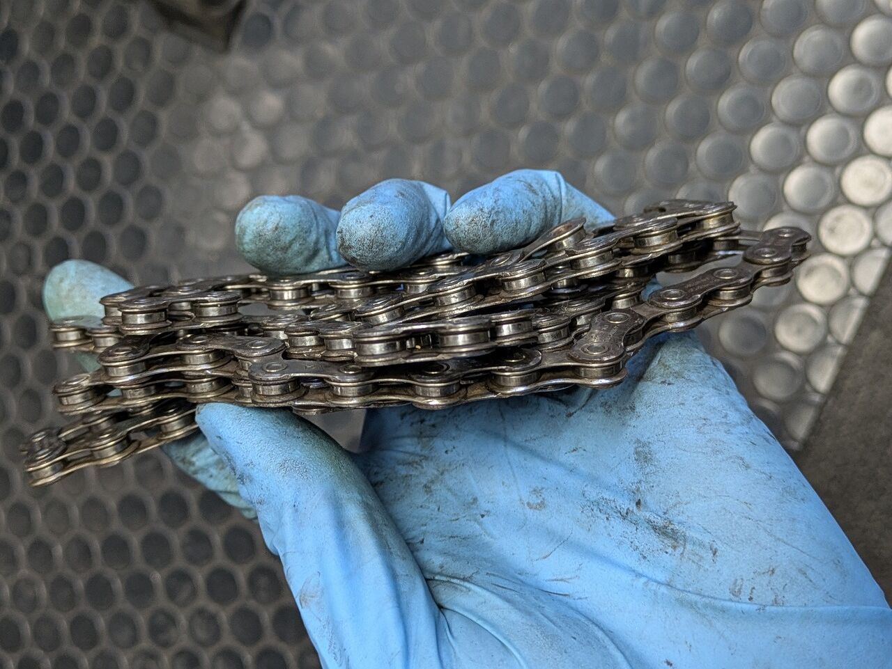 この状態の特徴は、外観がきれいであることです。チェーン表面には目立った汚れがなく、一見すると丁寧に手入れされているように見えます。しかし、よく観察すると、リンク内部まで潤滑が行き届いていないことがあります。